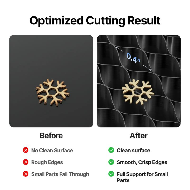 Grazie al design a nido d’ape, l’aria circola liberamente sotto il pezzo, limitando l’accumulo di calore e riducendo in modo significativo le tracce di bruciatura o carbonizzazione sul lato inferiore. Questo è particolarmente importante per il taglio di legno, compensato, pelle o alcuni materiali plastici.