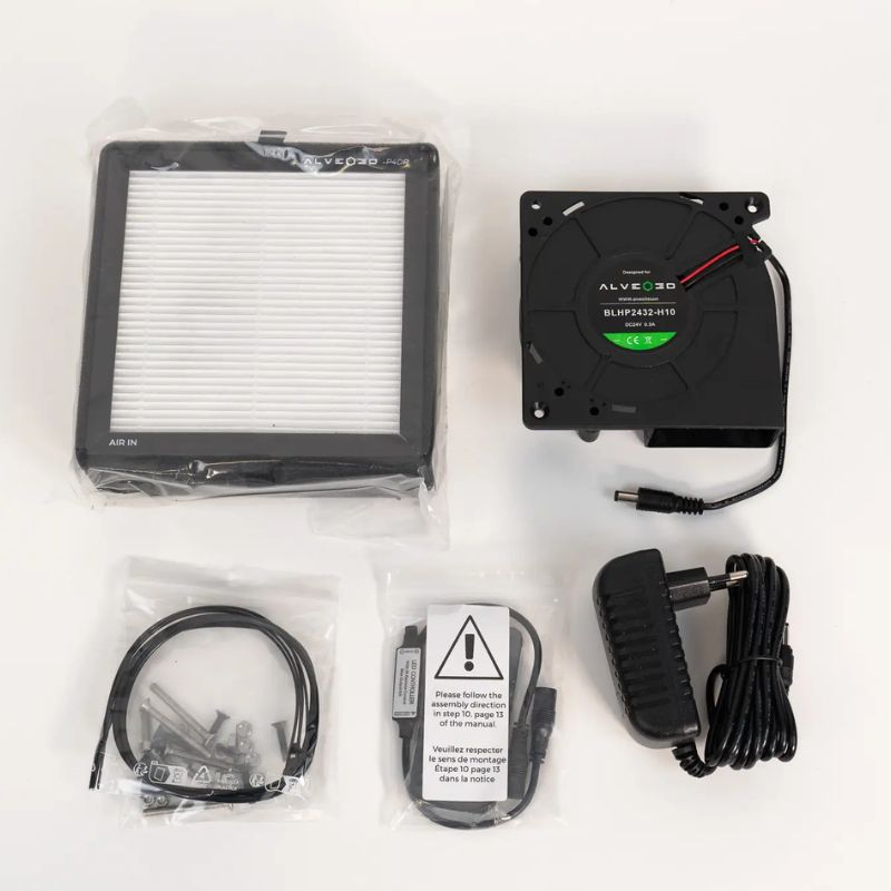 Il kit include: alimentatore e connettore DC, filtro P4DR, blower H10, guarnizioni O-ring NBR70, kit telecomando con ricevitore IR, viteria e fascette. È sufficiente stampare le parti del box con un filamento resistente a 60°C.