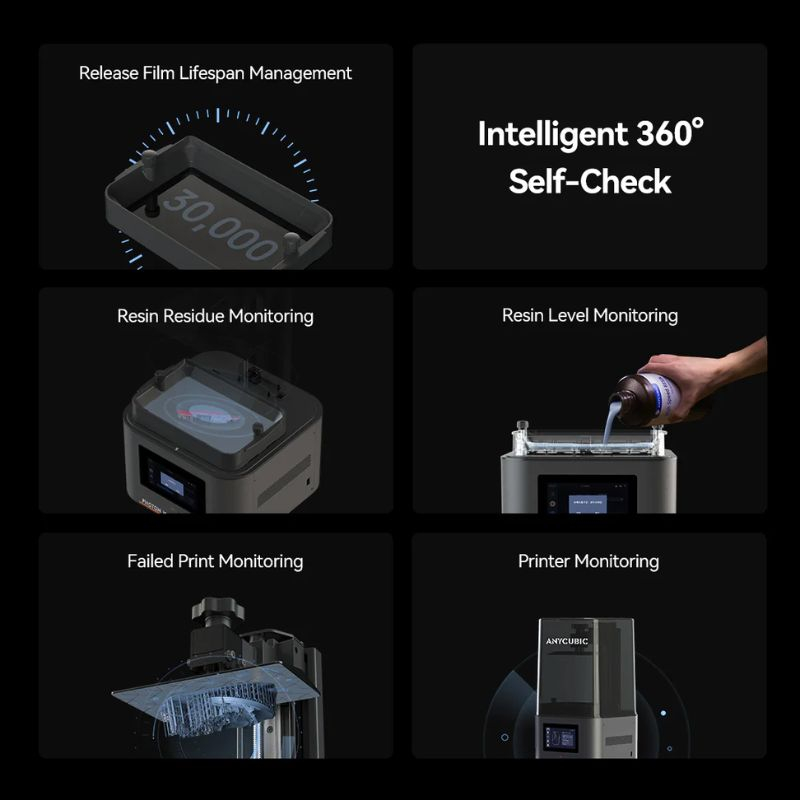 I sensori integrati monitorano il livello di resina e i residui, avvisando l’utente per manutenzione preventiva e meno stampe fallite.