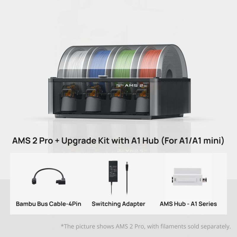 L'AMS 2 Pro con kit di aggiornamento è progettato per la serie Bambu Lab A1. Permette una gestione avanzata e automatizzata dei filamenti, con stoccaggio sicuro contro l’umidità e alimentazione multicolore affidabile. Ideale per stampe lunghe e complesse.