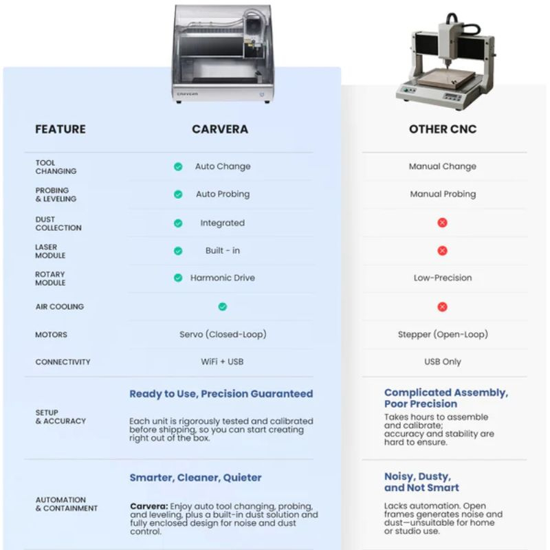 La Makera Carvera è una macchina CNC compatta progettata per professionisti e laboratori che vogliono combinare lavorazioni tradizionali e funzioni avanzate in un formato ridotto. Permette di realizzare prototipi, piccole serie o oggetti personalizzati con precisione e ripetibilità.