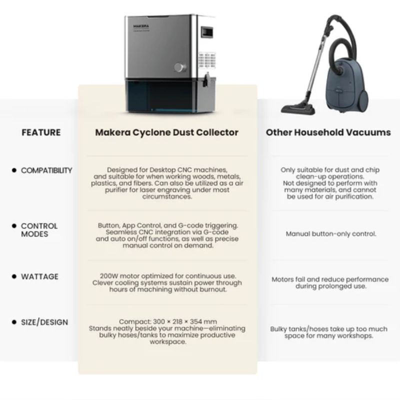 Mantenere un ambiente di lavoro pulito è essenziale per la qualità dei pezzi, la durata della macchina e la sicurezza dell’utente. Il Makera Cyclone Dust Collector soddisfa questi requisiti con un design efficiente e silenzioso, adatto a spazi ridotti. La combinazione di potenza, filtrazione avanzata e compattezza lo rende uno strumento indispensabile per qualsiasi postazione CNC da scrivania che voglia unire prestazioni e pulizia.