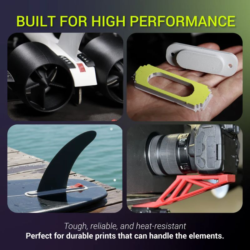Il filamento resiste a temperature fino a 133,7 °C (HDT), rendendolo adatto per pezzi esposti al calore o ambienti con variazioni termiche.