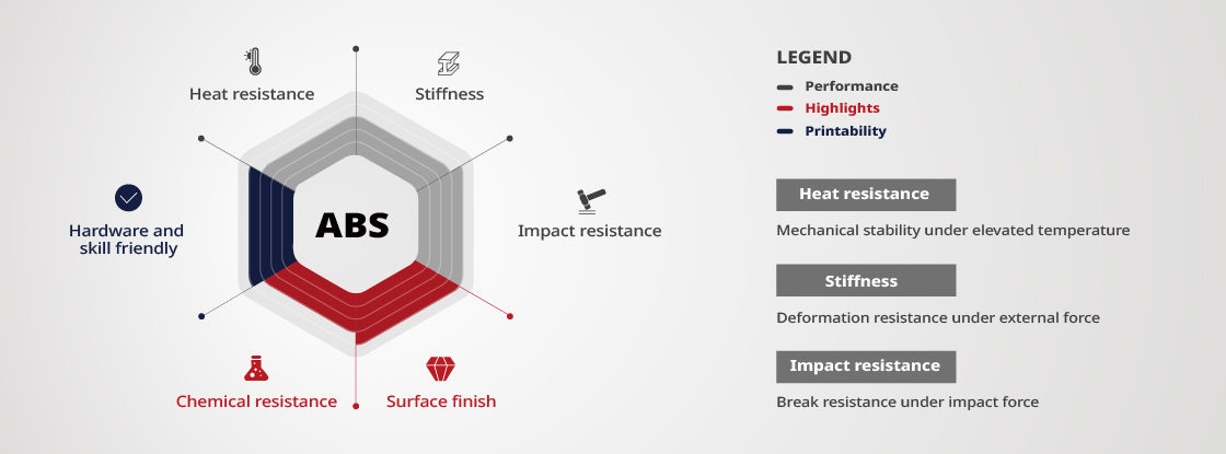 Resistenza generale: il filamento Raise3D Premium ABS Grigio offre una maggiore resistenza meccanica e termica rispetto al PLA, conferendo tutti i vantaggi per parti a uso meccanico.