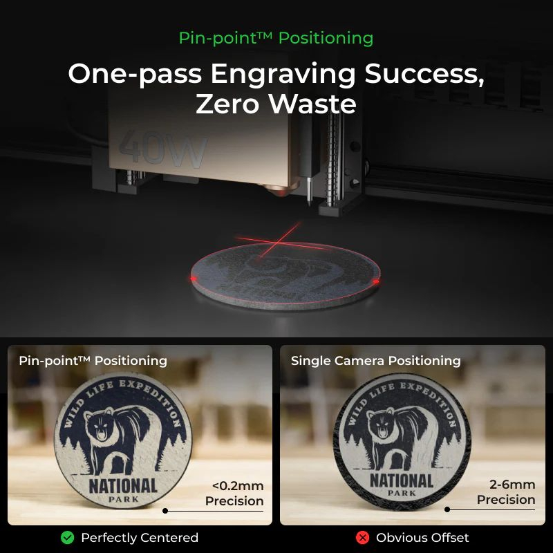 Grazie alla tecnologia di compressione laser, 8 laser da 6W vengono combinati in una potenza totale di 40W, garantendo capacità di taglio paragonabili alle macchine CO₂. Può tagliare legno massiccio fino a 18 mm. La compressione avanzata del punto luce consente una precisione superiore rispetto ai laser CO₂ tradizionali.