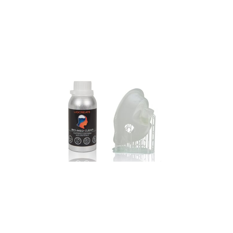 Liqcreate Clear resine resine Bio-Med è un fotopolimero biocompatibile rigido e trasparente che può essere lavorato sulla maggior parte delle stampanti 3D.