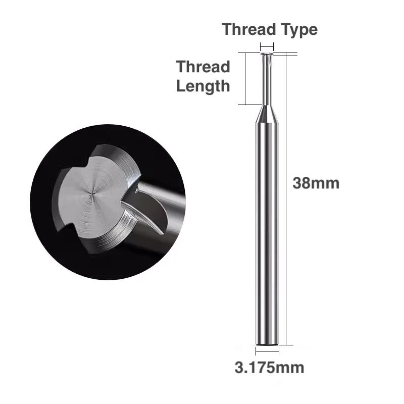 La fresa filettatrice M1 (Ø 0,7 mm) x 3 mm Makera Carvera è uno strumento CNC per filettatura destinato a piccole viti e accessori filettati. Con geometria ottimizzata per creare filetti interni precisi su micro-parti in metallo o plastica, si monta facilmente nel mandrino grazie al gambo da 3,175 mm (1/8").
