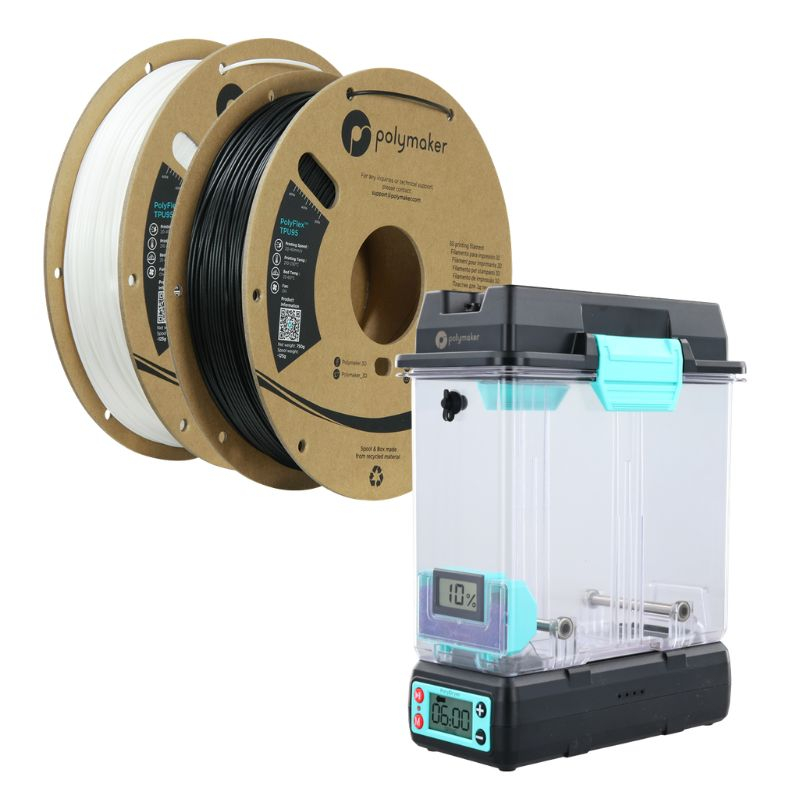 Questo pack Polymaker combina due filamenti PolyFlex TPU95 Nero e PolyFlex TPU95 Bianco con un PolyDryer Polymaker per garantire stampe 3D flessibili affidabili e ad alte prestazioni.