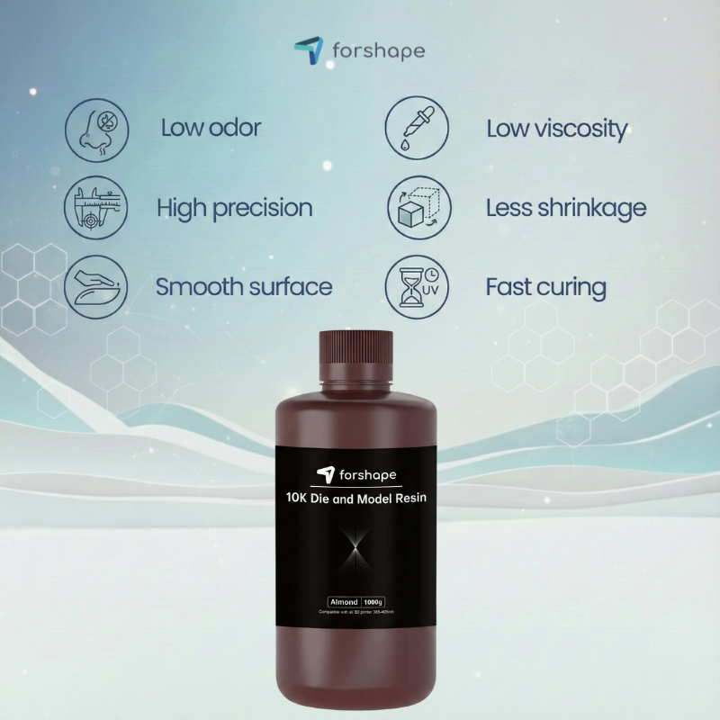 La Resina 10K Die and Model Almond Forshape Premium è una resina fotopolimerica di altissima qualità, appositamente sviluppata per la creazione di modelli dentali ad alto contrasto. La sua tonalità mandorla migliora la visibilità dei dettagli più fini, mentre l’elevata precisione garantisce tolleranze rigorose per parti rimovibili e applicazioni dentali complesse.