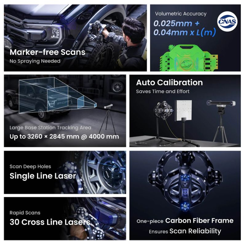 Il Revopoint Trackit utilizza una tecnologia avanzata di tracciamento ottico che elimina la necessità di posizionare marcatori. La stazione ottica e le sue telecamere sincronizzate seguono ogni movimento dello scanner, offrendo una scansione fluida e continua.