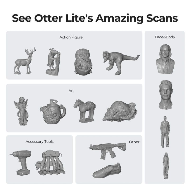 L’Otter Lite Basic mantiene il sistema a quattro lenti a doppia messa a fuoco, garantendo scansioni precise e dettagliate. Gli oggetti piccoli vengono catturati con grande finezza, mentre i modelli più grandi vengono acquisiti uniformemente, con riproduzione fedele di texture e contorni.