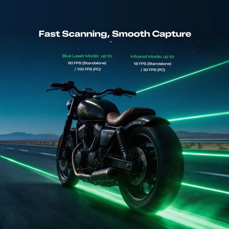 Acquisizione fino a 100 FPS su PC, garantendo scansioni rapide e fluide anche per oggetti voluminosi o complessi, ottimizzando tempi di produzione e ispezione.
