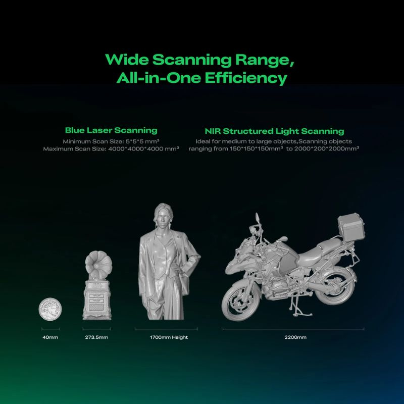 Combina laser blu e luce NIR per una cattura efficace di oggetti di qualsiasi dimensione.