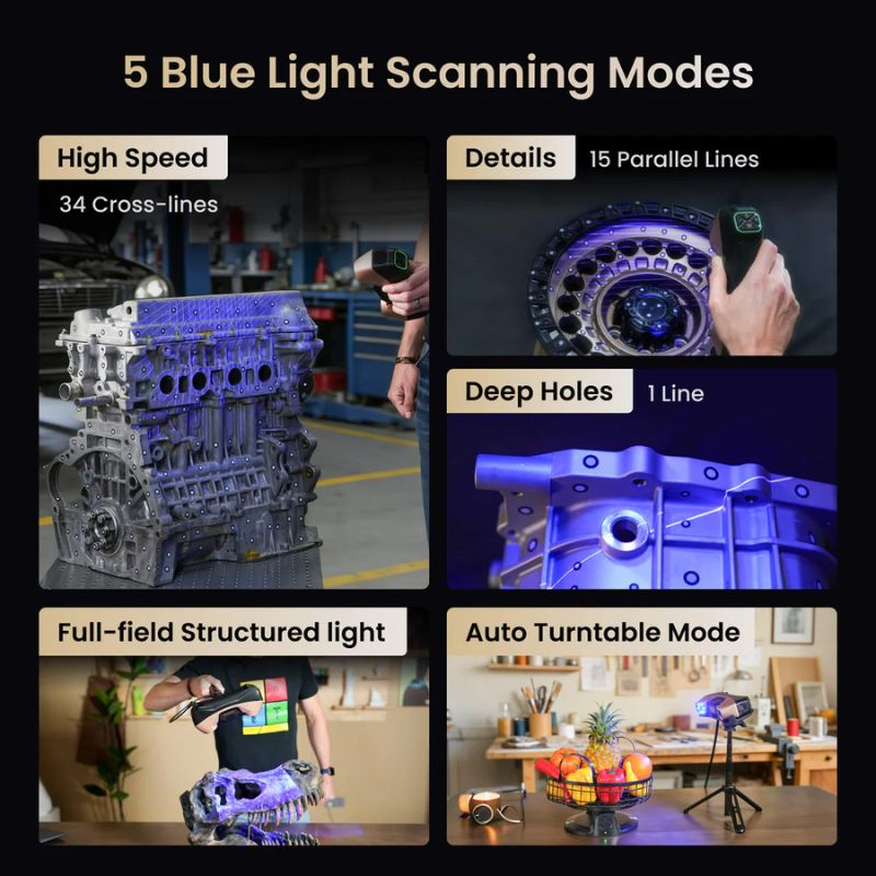 Il suo approccio multi-modalità consente di gestire superfici scure, lucide o dettagliate con o senza marcatori. È uno strumento pensato per professionisti della reverse engineering, del controllo qualità e della produzione additiva.