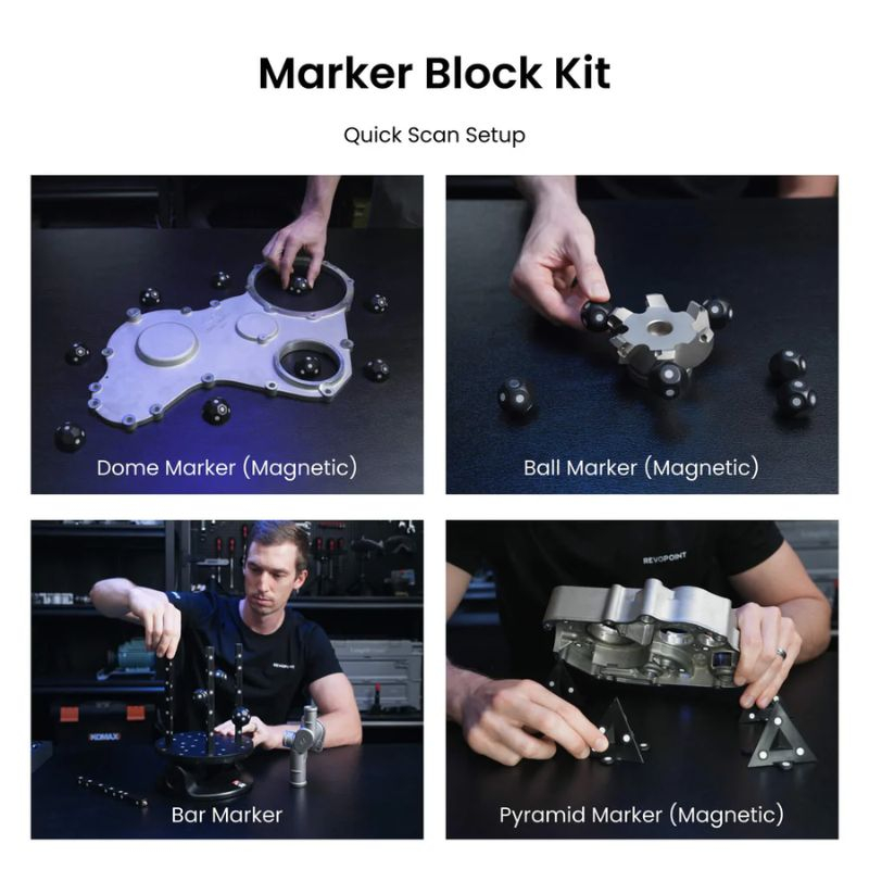Il kit di blocchi marker della versione Advanced migliora in modo significativo la stabilità del tracking e la continuità di scansione, soprattutto su oggetti poco strutturati o di grandi dimensioni. Grazie ai marker magnetici a sfera, cupola e piramide, oltre a barre e marker da 6 mm, è più facile strutturare l’ambiente di scansione e garantire un allineamento preciso delle nuvole di punti.