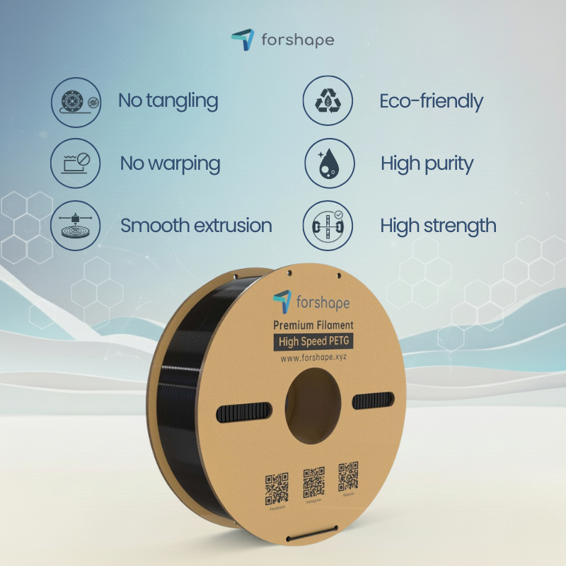 Stampa rapida e fluida: High-Speed PETG Forshape è stato sviluppato per supportare alte velocità di stampa mantenendo un deposito costante e senza sbavature. La sua viscosità controllata evita blocchi nell'estrusore, garantendo stampe continue e affidabili anche su modelli complessi. Questa caratteristica riduce significativamente i tempi di produzione e aumenta l'efficienza.