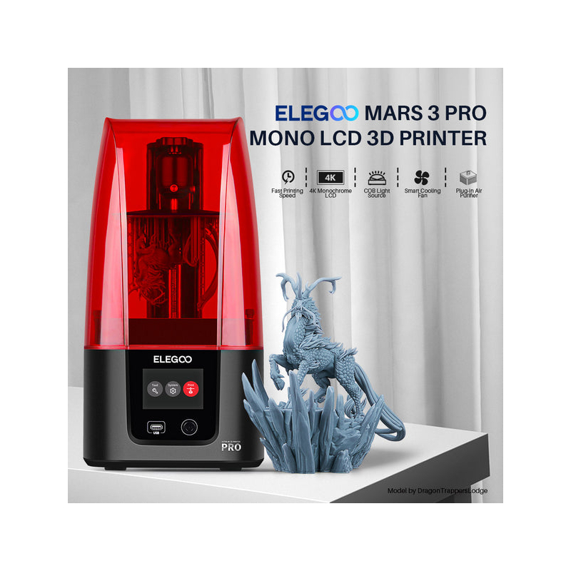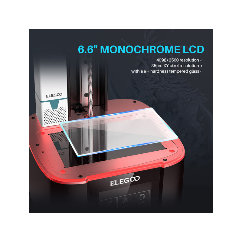 ELEGOO Mars 3 Pro è dotato di uno schermo monocromatico 4K da 6,6 pollici LCD con una risoluzione di 4098*2560px e una risoluzione XY di 35μm, che offre stampe con dettagli e precisione che superano di gran lunga le stampanti FDM in termini di qualità e velocità.