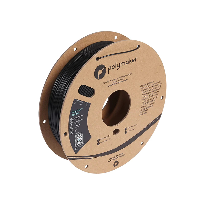 PolyFlex TPU90 Black è un filamento 3D progettato da Polymaker. Questo elastomero con durezza shore 90 assicura un'elevata resistenza alla rottura e ai raggi UV, rendendolo durevole nel tempo.