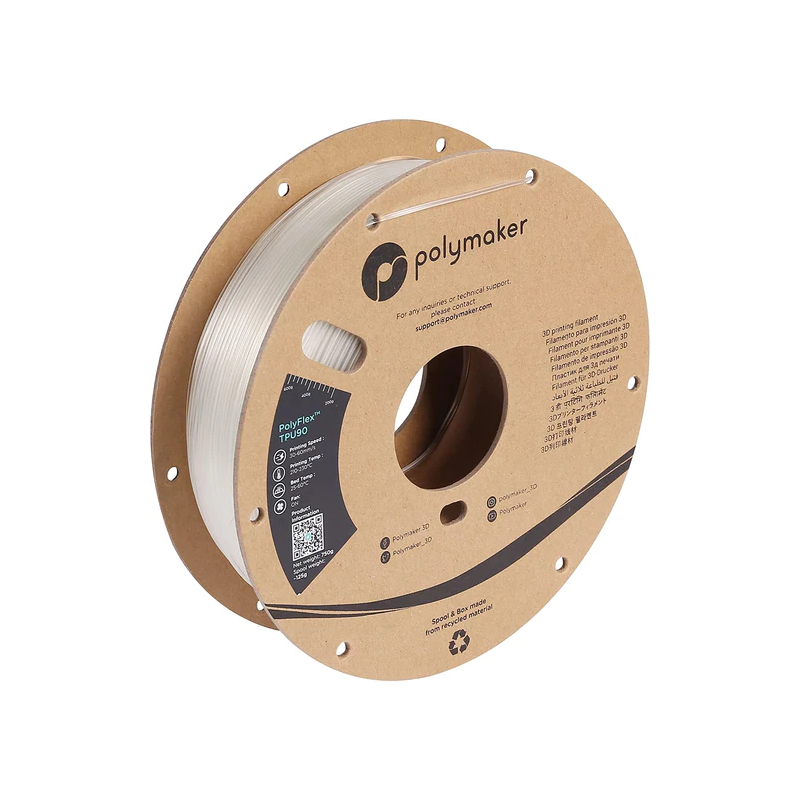 Il PolyFlex TPU90 Clear di Polymaker è un filamento flessibile e traslucido, perfetto per pezzi resistenti ai raggi UV e agli strappi.