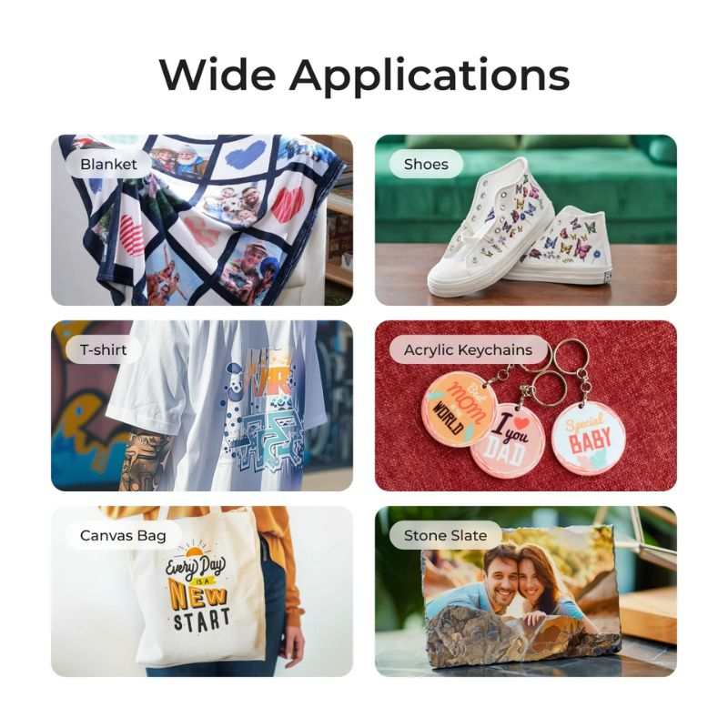 Questo kit completo è compatibile con una varietà di materiali, come vinile termoadesivo (HTV), sublimazione, trasferimenti DTF e molto altro. È perfetto per personalizzare abbigliamento, borse, accessori, cappelli e altri oggetti in tessuto.